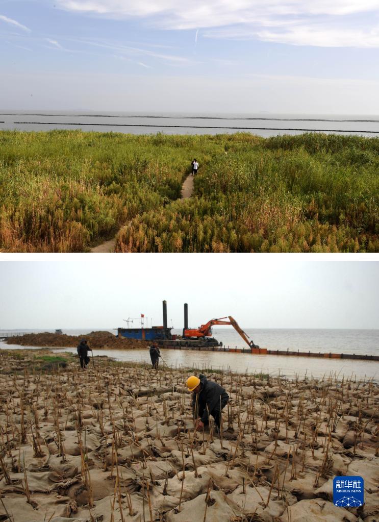 这是一张拼版照片:上图为2022年9月6日拍摄的巢湖岸边的芦苇湿地(新华社记者刘军喜摄);下图为2010年4月6日拍摄的工作人员在巢湖岸边种植芦苇。