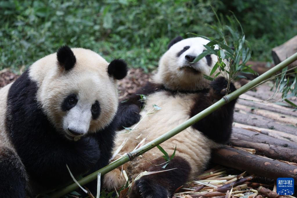 这是9月21日在成都大熊猫繁育研究基地内拍摄的大熊猫龙凤胎姐弟“和花”(右)与“和叶”。