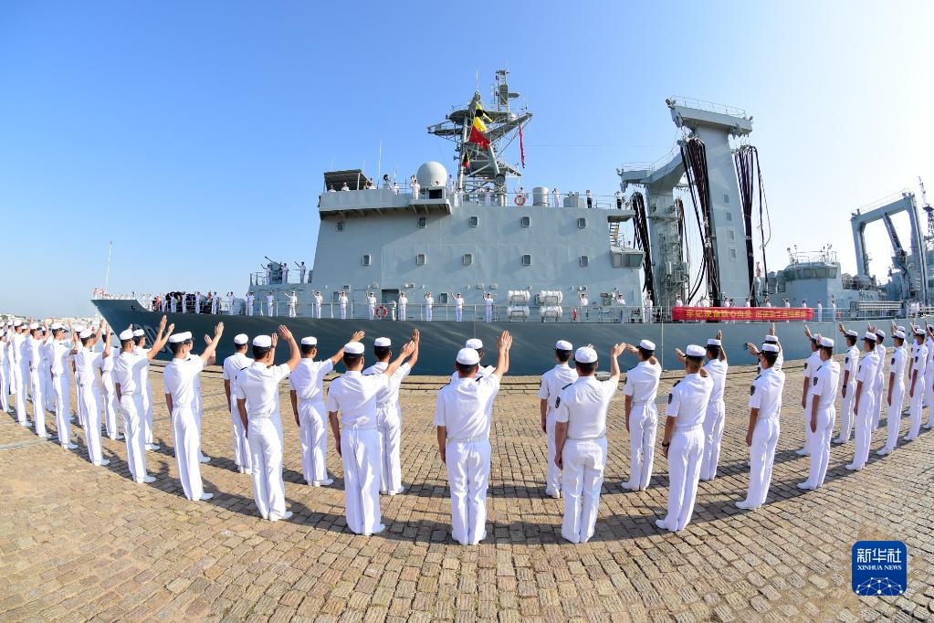 9月21日,中国海军第42批护航编队从山东青岛某军港解缆起航。这是官兵们在向可可西里湖舰挥手告别。