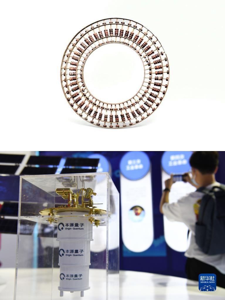 这是一张拼版照片:上图为明代铜圆八卦算盘(安徽程大位珠算博物馆供图);下图为在2022世界制造业大会上,合肥本源量子计算科技有限责任公司展出的24比特超导量子计算机模型(新华社记者周牧2022年9月20日摄)。