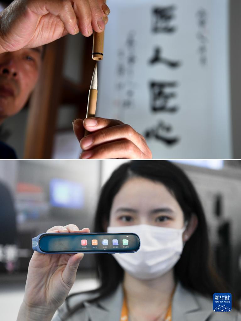 这是一张拼版照片:上图为国家级非物质文化遗产“宣笔制作技艺”代表性传承人佘征军在泾县“守艺人”工作室展示自己制作的宣笔(新华社记者韩晓雨2020年6月5日摄);下图为2022世界制造业大会上工作人员展示科大讯飞生产的一款AI翻译笔(新华社记者张端2022年9月20日摄)。