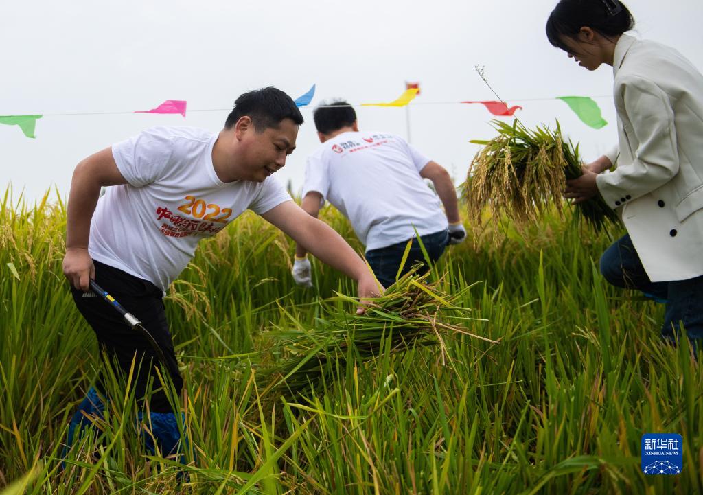 9月21日,在益阳市南县麻河口镇东胜村,当地村民和游客在比拼收割水稻。