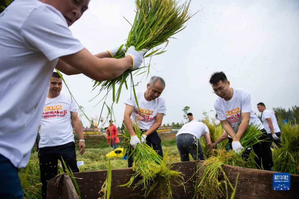 9月21日,在益阳市南县麻河口镇东胜村,当地村民和游客在比拼收获稻谷。