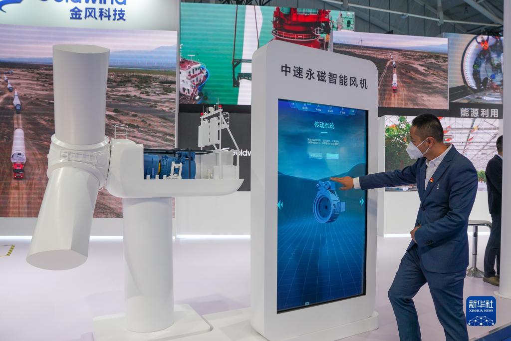 9月21日,在第七届中国-亚欧博览会上,新疆金风科技股份有限公司展位的工作人员在介绍中速永磁智能风机。
