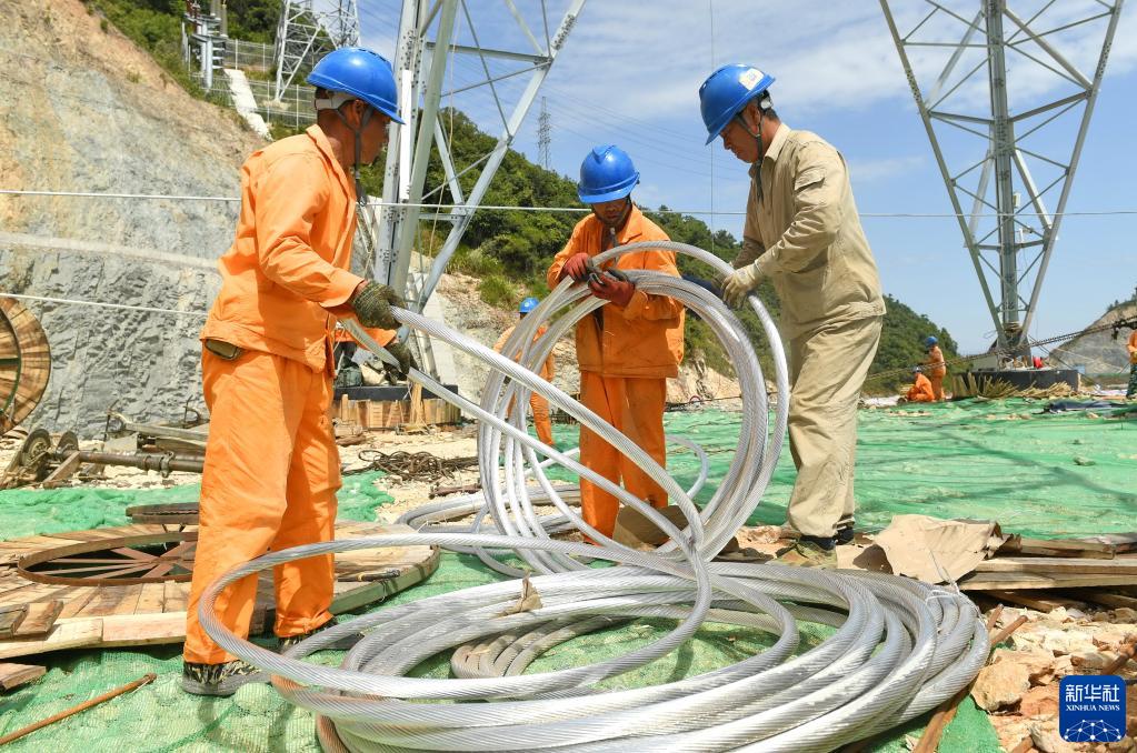 9月21日,国网福建省送变电工程有限公司施工人员在宁德市霞浦县的B7塔处架线施工。