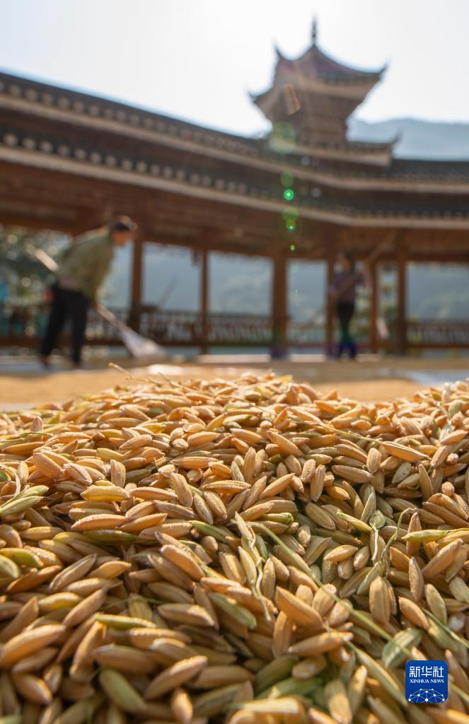 贵州省从江县刚边壮族乡刚边村,村民在晾晒稻谷(9月18日摄)。