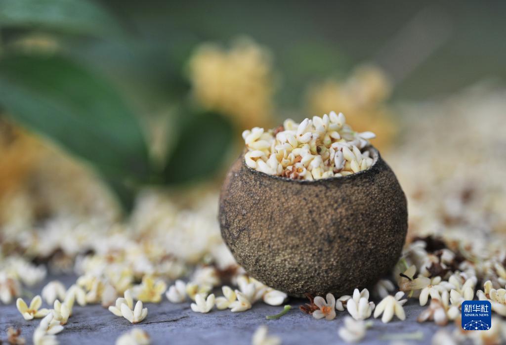 云南省丽江市古城区一公园,小石桌上铺满桂花(9月16日摄)。