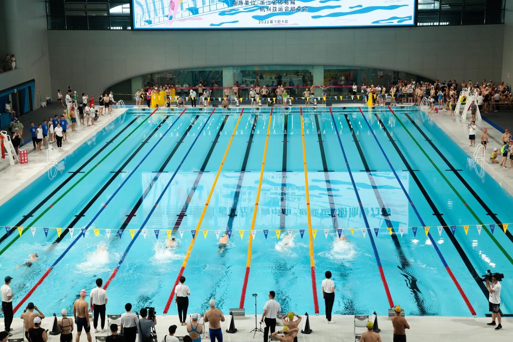 这是亚运会比赛场馆——杭州奥体中心游泳馆内举行的游泳比赛,参赛者均为普通游泳爱好者。图片由场馆提供