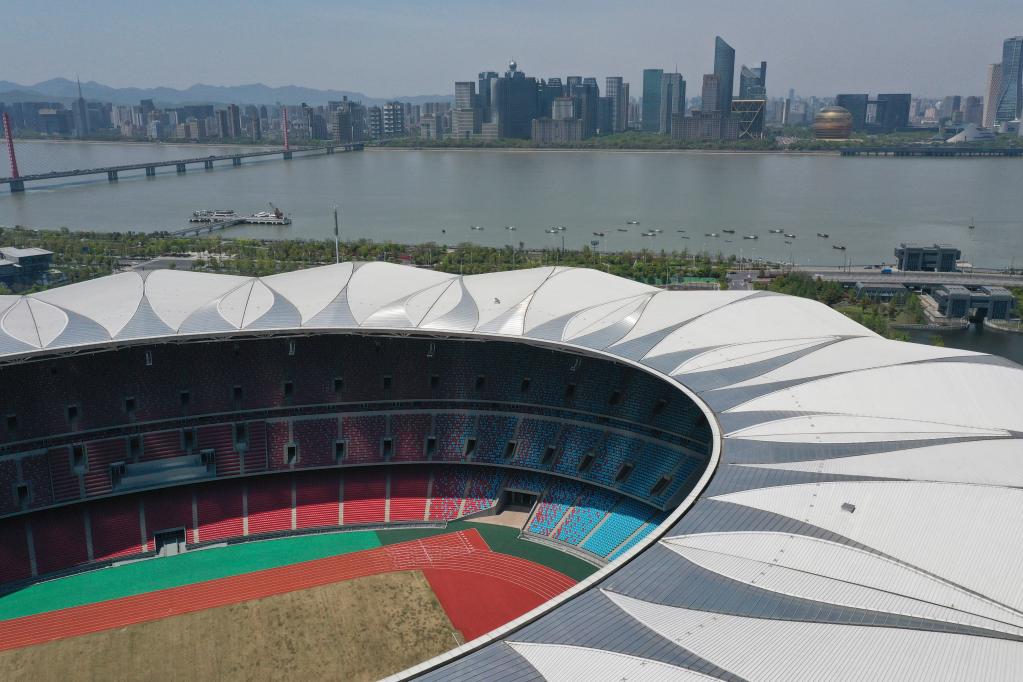 这是钱塘江畔的2022年亚运会主会场——杭州奥体博览中心主体育场(无人机拍摄)。新华社记者 黄宗治 摄