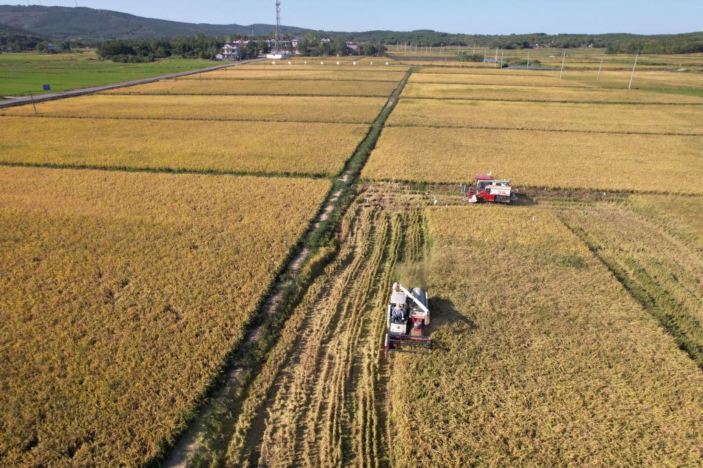9月19日,含山县正前水稻种植专业合作社工作人员正在收割水稻。新华社发(张敏 摄)