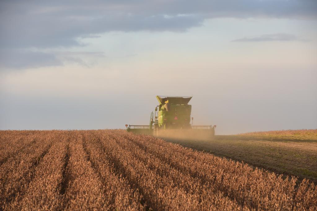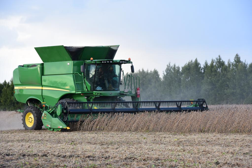 14时30分,农技技术员刘恩坪用对讲机下达了作业指令,5台大型联合收割机同时向前推进。农机的轰鸣声瞬间盖过了秋风的呼啸,成片的大豆被卷进割台,秸秆和豆荚被粉碎后直接抛撒在田中。