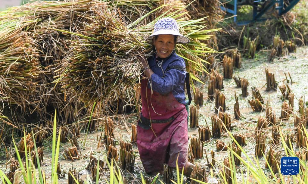 9月22日,融水苗族自治县红水乡良陇村村民喜收秋稻。