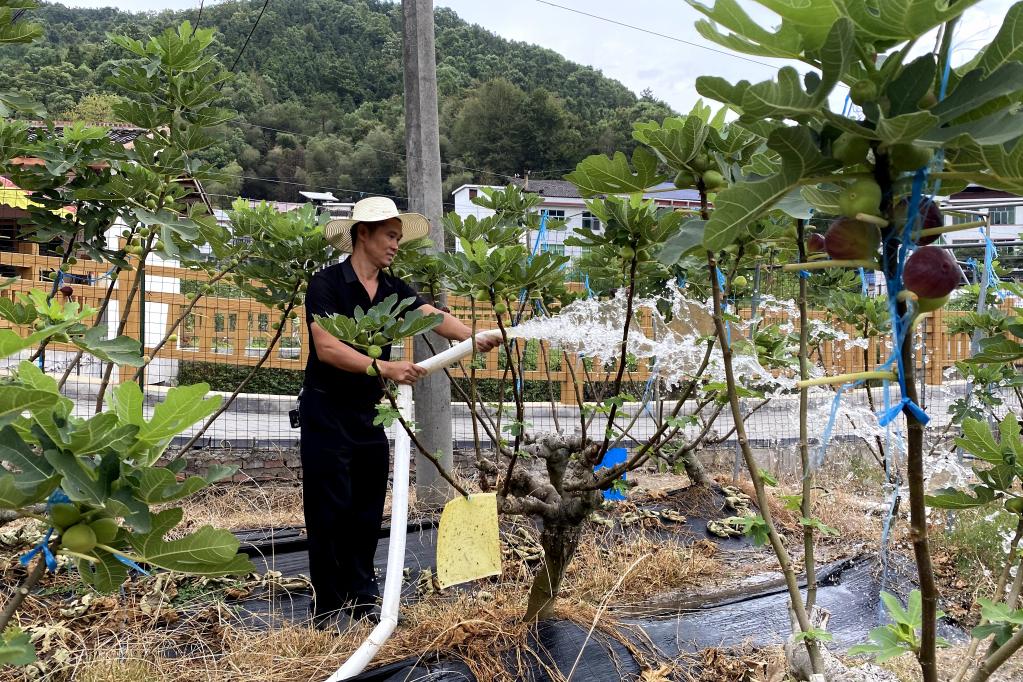 图为李畋村村民在无花果园浇水。新华社记者柳王敏 摄