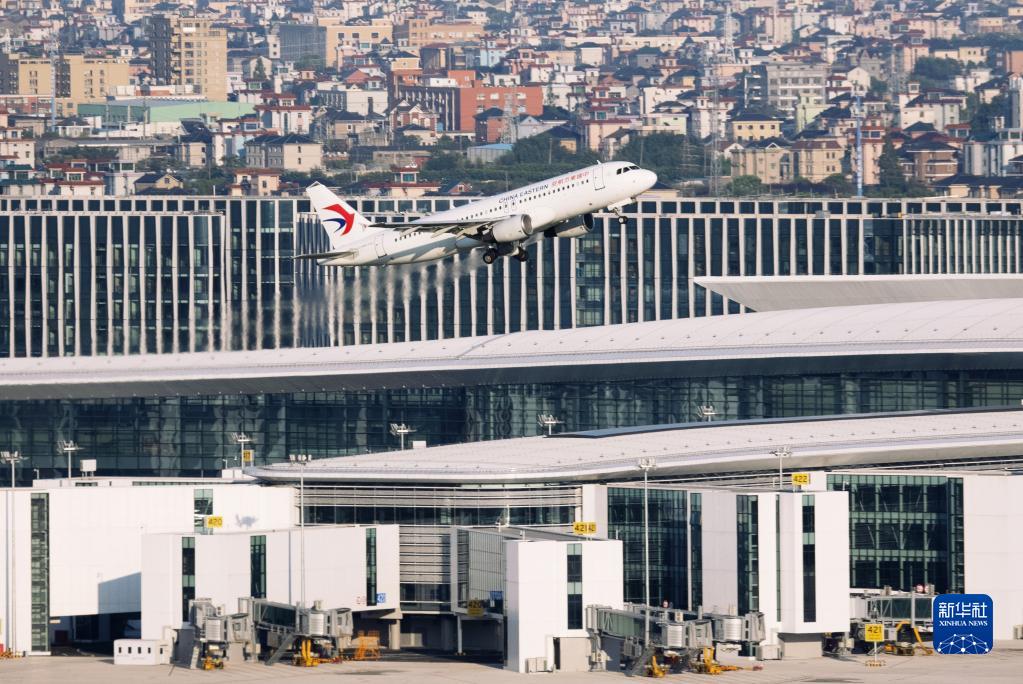 9月22日,一架东航客机从杭州萧山国际机场三期T4航站楼前起飞。