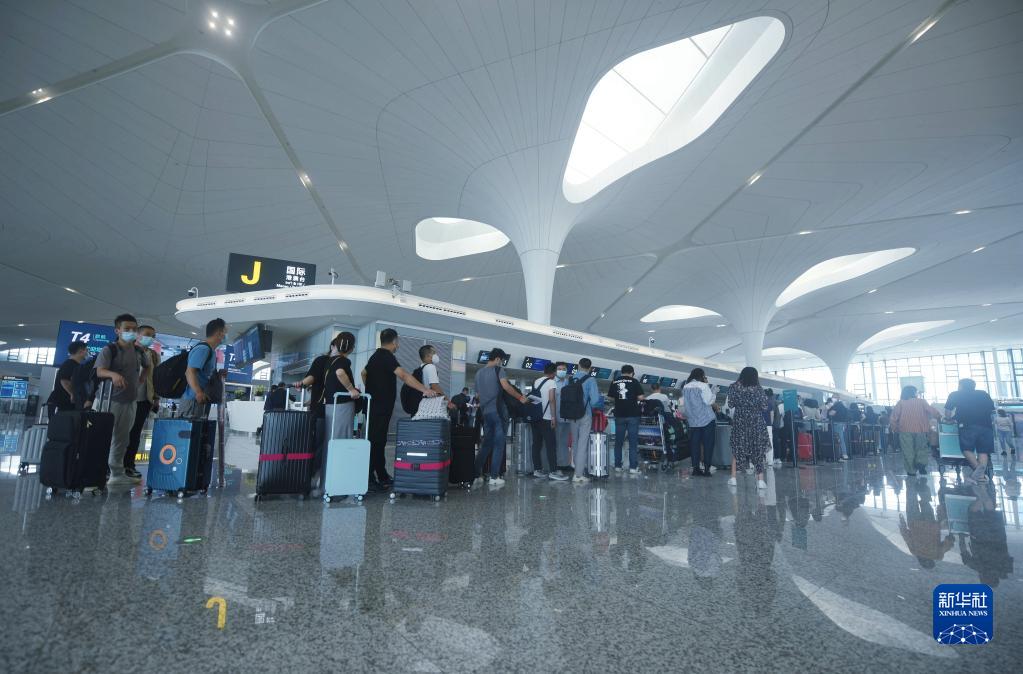 9月22日,旅客在杭州萧山国际机场三期T4航站楼出发大厅排队值机。