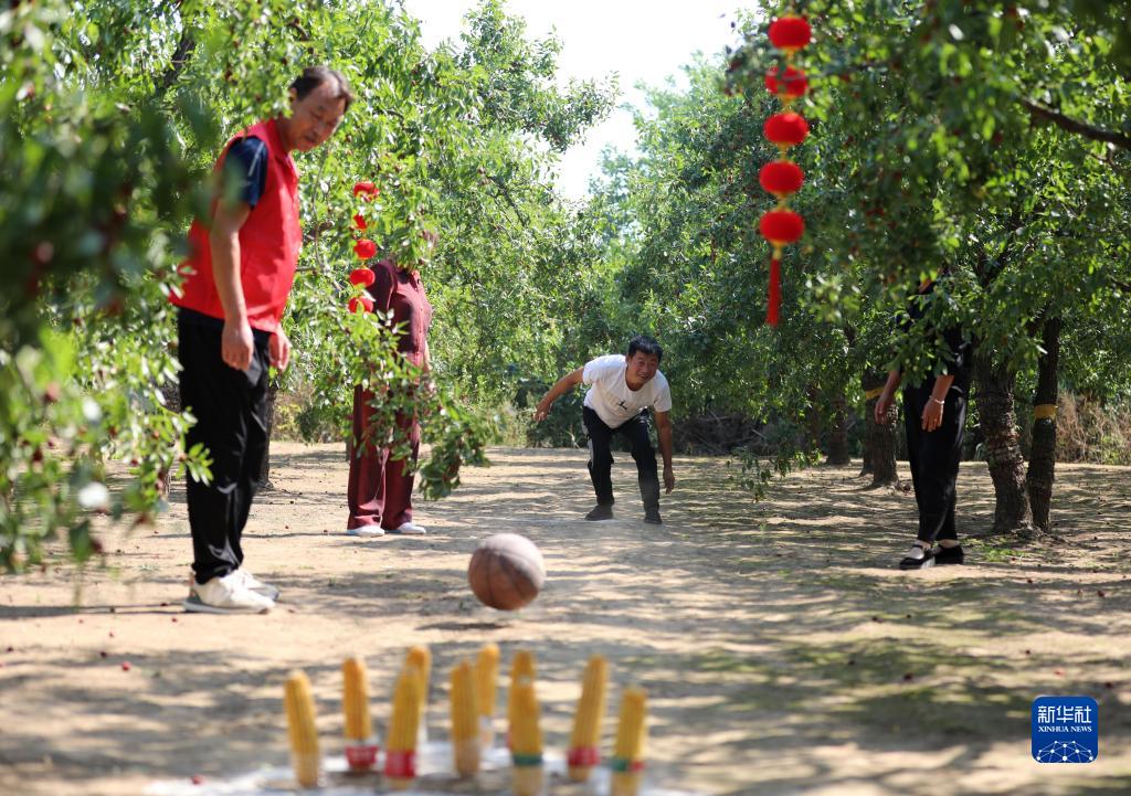 9月22日,河北省沧州市沧县一位村民参加“玉米保龄球”比赛。