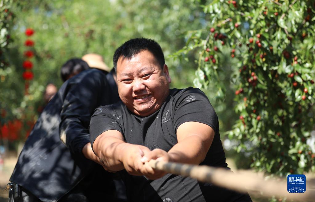 9月22日,河北省沧州市沧县村民进行枣林拔河比赛。
