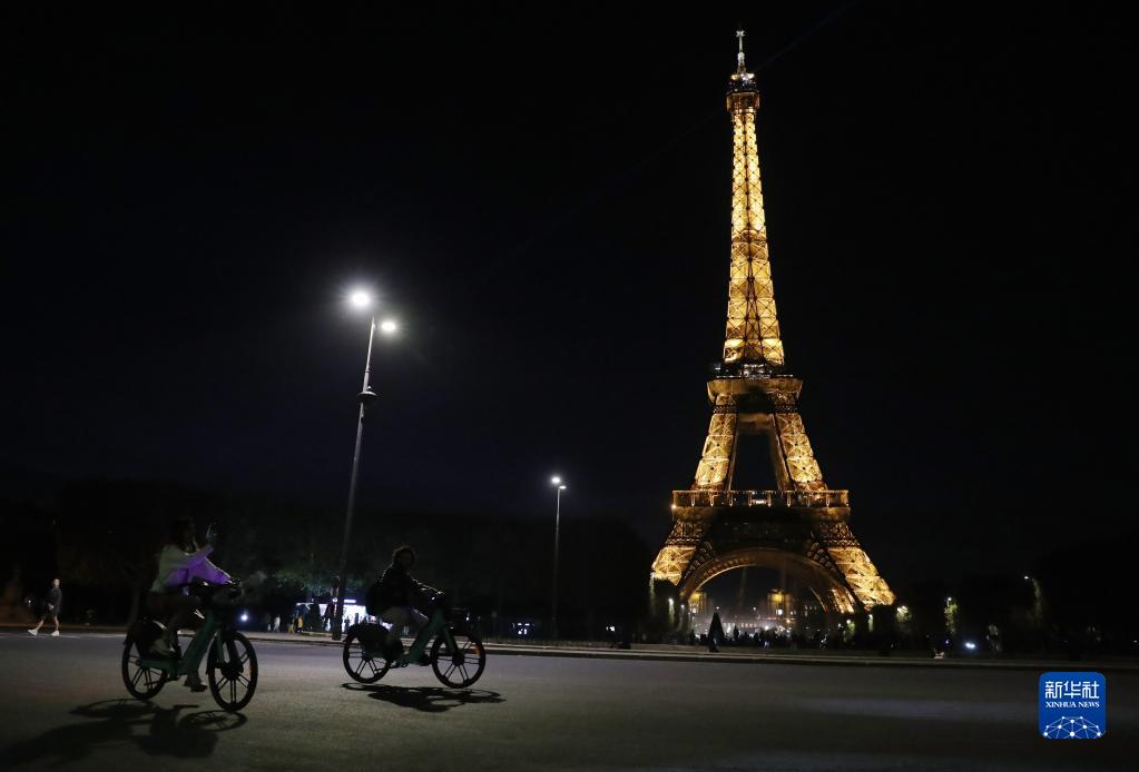 这是9月22日拍摄的亮灯的法国巴黎地标性建筑——埃菲尔铁塔。