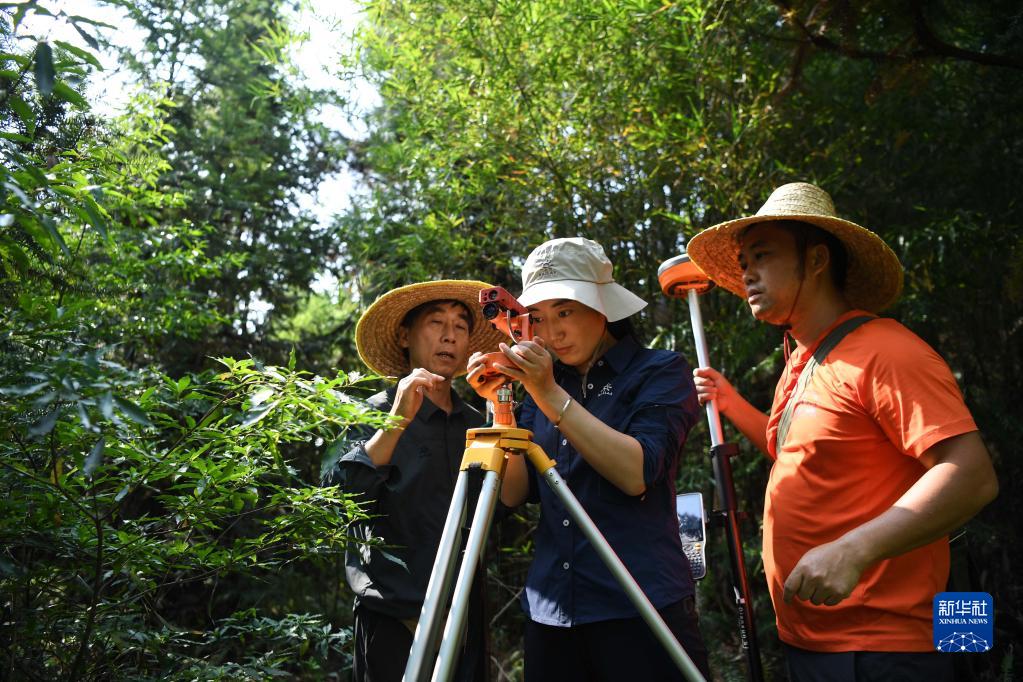 9月22日,在广东韶关乐昌市张溪村的生态监测样地,白拉曲珍(中)和师傅江建发(左)、同事伍国清在操作设备。