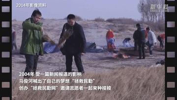 甘肃青梭公益发展中心负责人马俊河,从2007年开始坚守大漠,和父老乡亲一起压沙治沙,和来自全国各地的志愿者一道治沙造林。