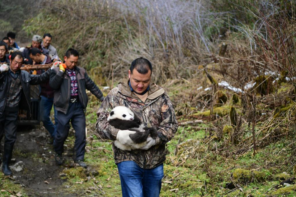 吴代福身穿涂有大熊猫妈妈气味的工作服转移幼崽。