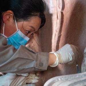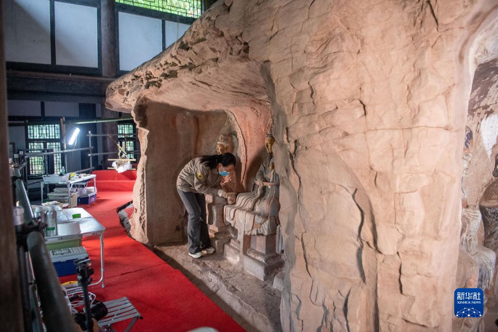 9月22日,大足石刻研究院保护工程中心的工作人员对舒成岩摩崖造像进行本体修复。