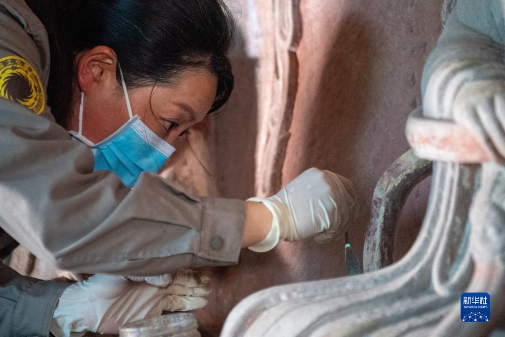 9月22日,大足石刻研究院保护工程中心的工作人员对舒成岩摩崖造像进行本体修复。