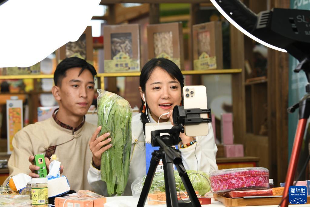 9月23日,在四川省成都市天府农业博览园2号展馆,金秋消费季农产品产销对接活动参展商在进行直播。