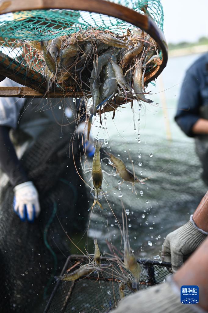 9月23日,丰盛湾水产养殖基地的工人在分装捕获的沼虾。