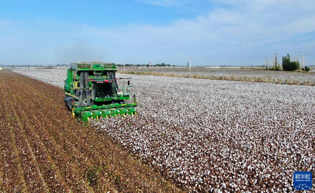 采棉机在新疆沙湾市柳毛湾镇的棉田里采收棉花(9月22日摄,无人机照片)。