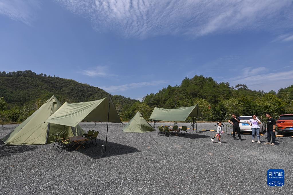 9月24日,在杭州市临安区太阳镇上庄村的牧光谷露营基地,“90后”负责人何威(右一)在和游客互动。该基地是2022年5月刚投入运营的网红露营基地,带动周边30余名农户就业。