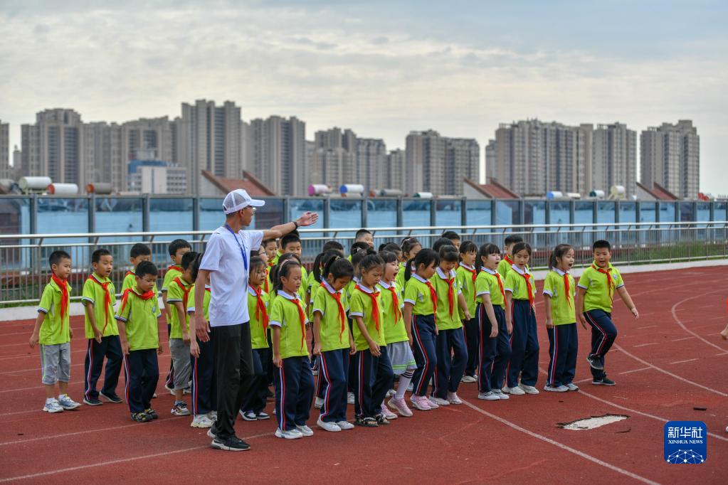 9月20日,齐河县第六小学学生在空中运动场上体育课。这所地处闹市的学校将地下停车、地上教学、运动场地分层穿插布局巧妙融合,节地率达到54%。