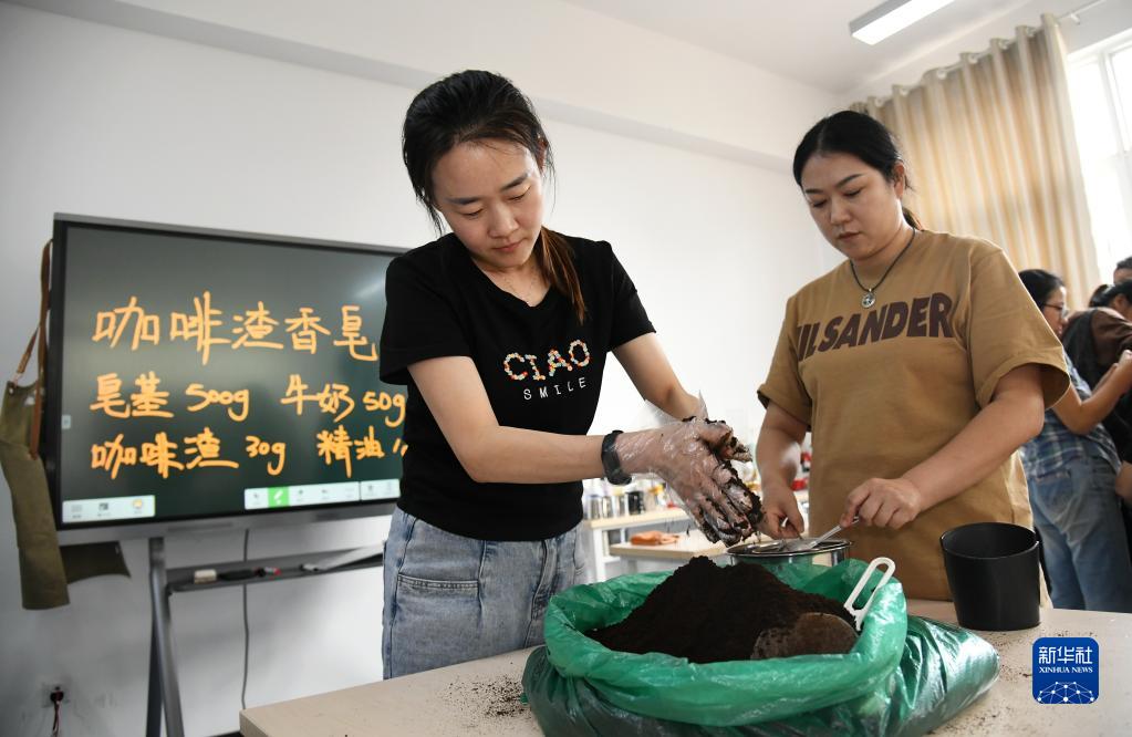 9月22日,在“无声咖啡师”公益培训课上,学员为制作咖啡渣香皂做准备工作。