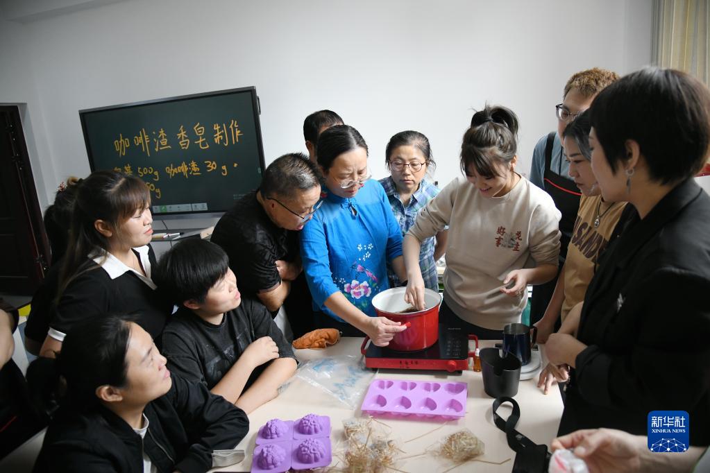 9月22日,在“无声咖啡师”公益培训课上,学员们在学习制作咖啡渣香皂。