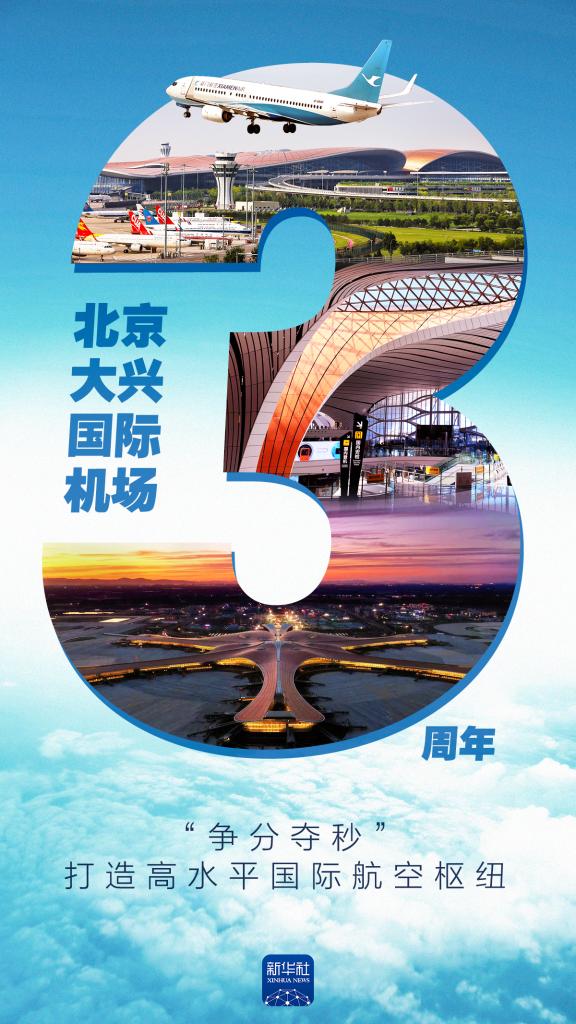 作为首都重大标志性工程,国家发展一个新的动力源,三年来,大兴机场以建设世界级航空枢纽为目标,在平安、绿色、智慧、人文四型机场建设上努力前行,不断满足人民群众对美好航空出行的新需要。