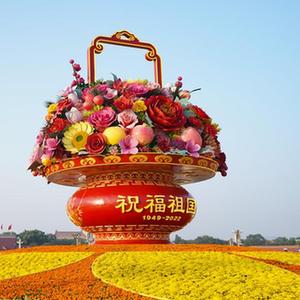 国庆节临近,“祝福祖国”巨型花果篮亮相北京天安门广场。今年“祝福祖国”巨型花果篮顶高18米,以喜庆的花果篮为主景,花坛底部直径48米。