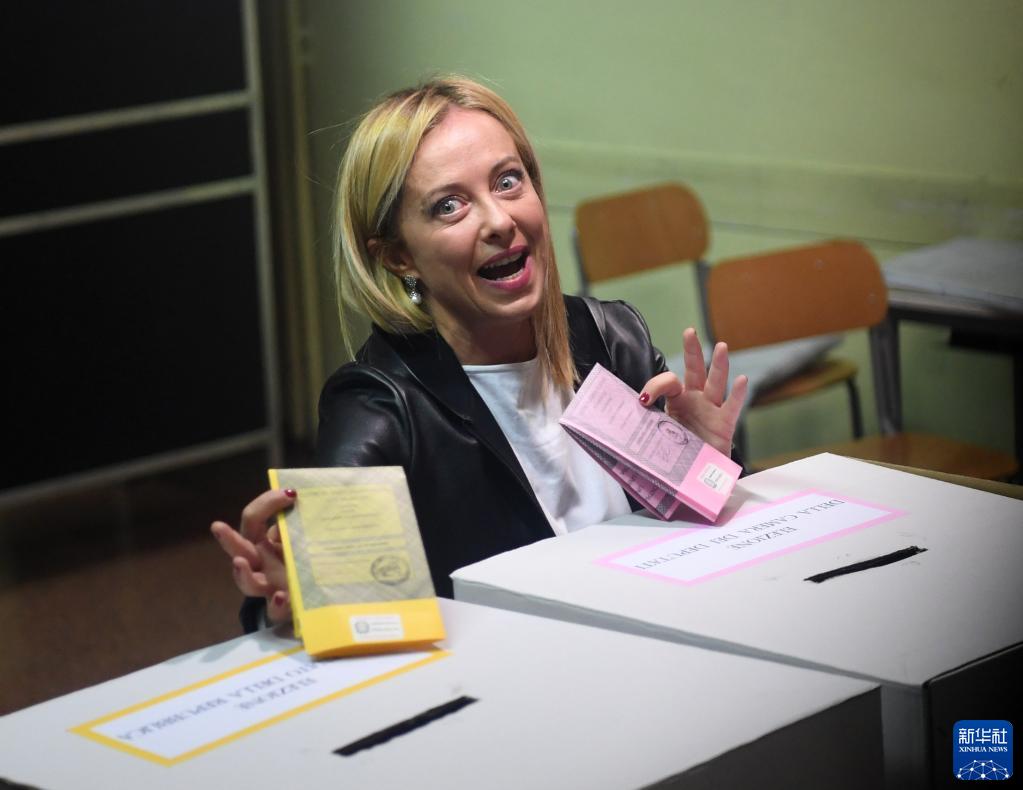 9月25日,意大利兄弟党党首乔治娅·梅洛尼在罗马一处投票站展示选票。新华社记者 金马梦妮 摄