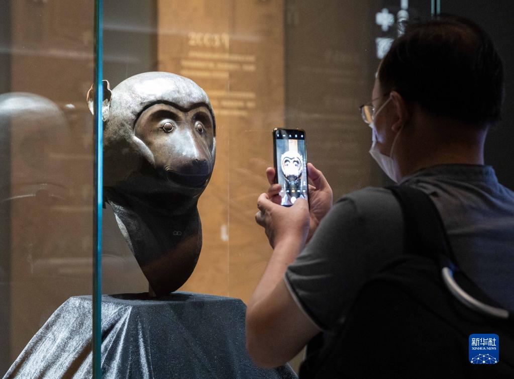 9月26日,观众在拍摄展出的猴首。新华社记者 王翔 摄