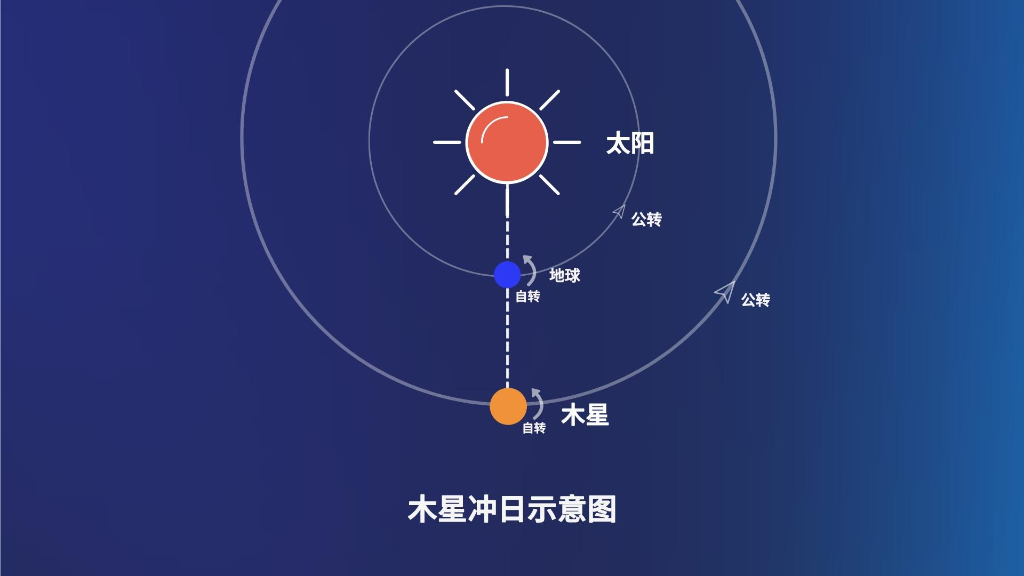 木星冲日当天,木星和太阳正好分处地球两侧,三者几乎成一条直线,木星被太阳照亮的一面会完全朝向地球。木星与地球的会合周期大约是399天,差不多每隔13个月左右就会有一次冲日。