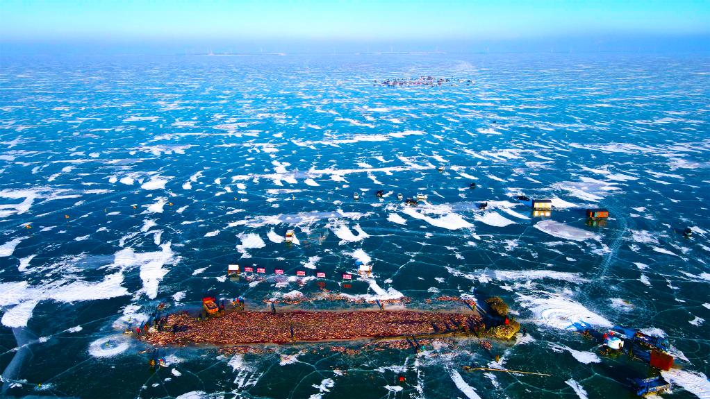 这是2021年12月29日无人机拍摄的查干湖冬捕画面。(毕重明 摄)