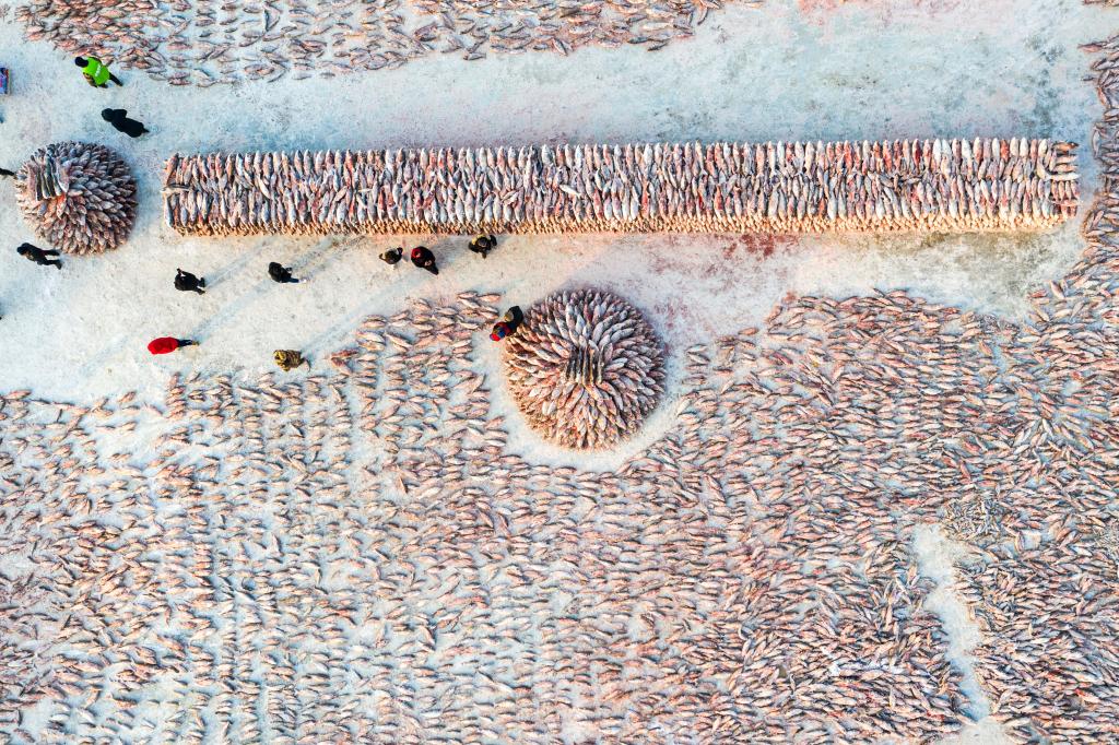 2019年12月27日,在查干湖渔场超市,消费者选购查干湖鱼(无人机拍摄)。新华社记者 张楠 摄