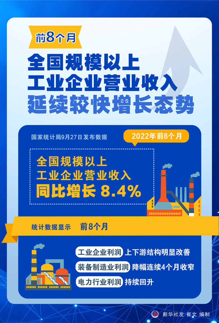 新华社北京9月27日电(记者魏玉坤)国家统计局27日发布数据,今年前8个月,全国规模以上工业企业营业收入同比增长8.4%,延续较快增长态势;企业利润同比下降2.1%。