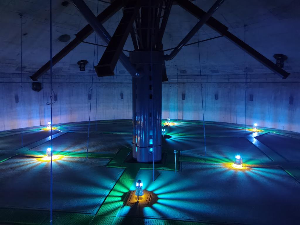 浅圆仓内,10盏蓝色的多光谱紫光灯发出淡淡蓝光,稻谷整齐而平坦地存放在几大块区域内。“紫光灯可以很好地诱杀可能在粮仓出现的30多种害虫。”该仓保管员闫科向记者介绍。