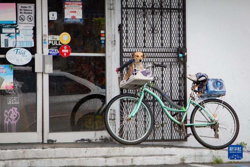 9月27日,在美国佛罗里达州迈阿密,一辆装载着瓶装水的自行车停在商店门前。新华社发(莫妮卡摄)