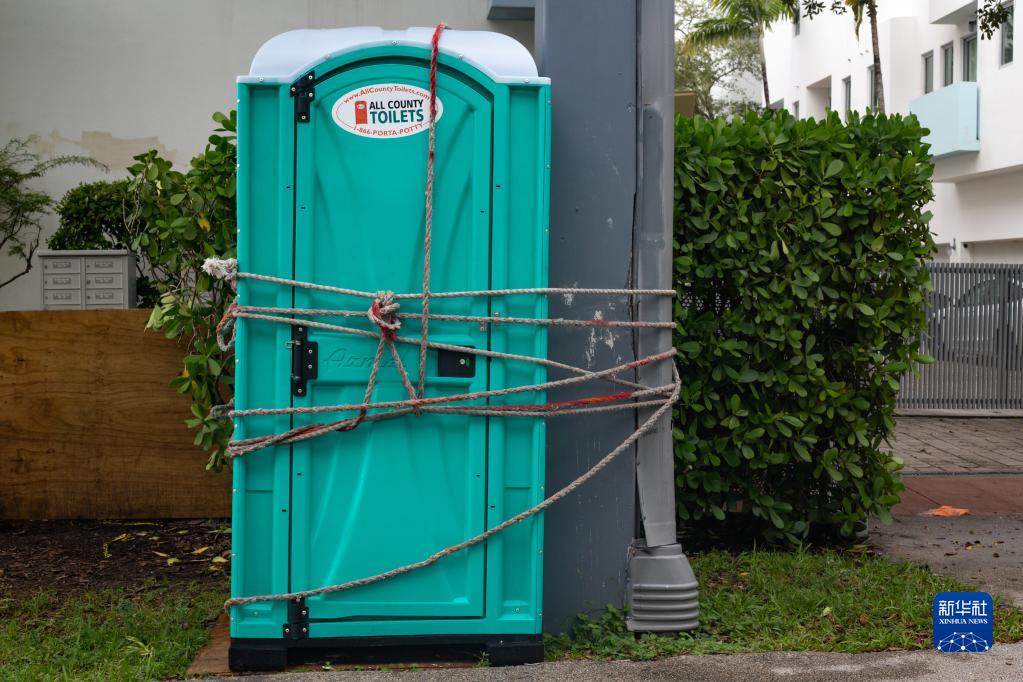 9月27日,在美国佛罗里达州迈阿密,一处移动厕所被固定到柱子上,防备即将到来的飓风。新华社发(莫妮卡摄)