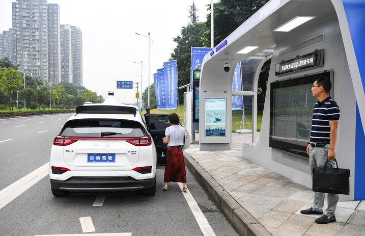 在重庆永川城区,乘客乘坐百度Apollo自动驾驶出行服务车。新华社记者 王全超 摄
