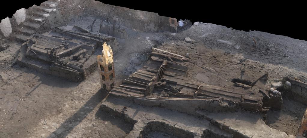 在码头群遗迹中,考古工作者发现了8座宋代码头,1艘北宋时期的沉船和1艘南宋时期的沉船。其中,南宋沉船已经清理完成,目前已经整体打包提取,进入室内清理和脱水加固阶段;对北宋沉船的揭露工作还在进行。