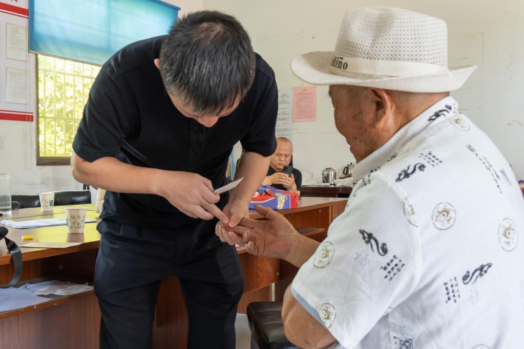 图为柯伟力在给刘金山采集血样,用于比对DNA。(受访者供图)