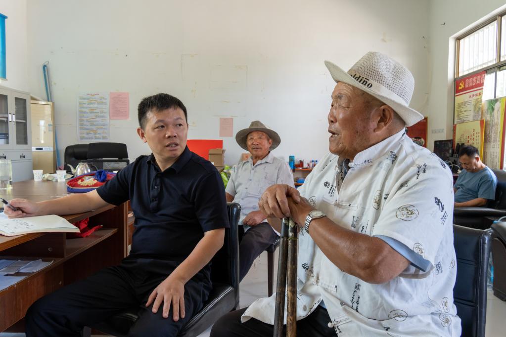 图为刘金山(前排右)在给柯伟力讲述家族史。(受访者供图)