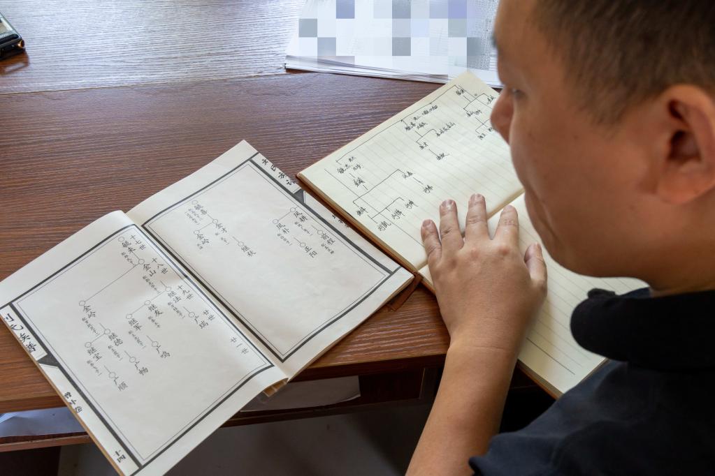 图为柯伟力在抄录刘氏族谱。(受访者供图)